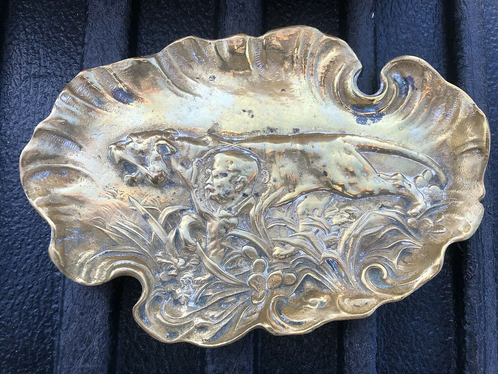 Antique Art Nouveau President Teddy Roosevelt Brass Tiger Tray Gratuity Dish OLD